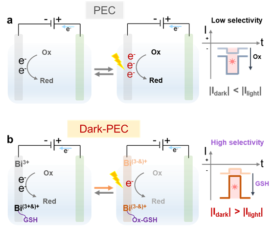 鑒于此,武漢工程大學(xué)胡六永教授以及華中師范大學(xué)朱成周教授課題組合作在PEC系統(tǒng)的選擇性調(diào)控與機(jī)制創(chuàng)新研究中取得了新進(jìn)展。該團(tuán)隊設(shè)計并構(gòu)建了一種基于溴氧化鉍(BiOBr)光陰極的暗增強(qiáng)光電化學(xué)(dark-PEC)系統(tǒng),突破了傳統(tǒng)PEC系統(tǒng)光增強(qiáng)的固有模式。利用鉍的可逆還原特性,實現(xiàn)了光陰極上氧還原位點的鈍化與再生,成功獲得了|Idark| > |Ilight|的非常規(guī)反向光電流信號。借助谷胱甘肽與BiOBr之間的選擇性結(jié)合及電荷轉(zhuǎn)移作用,顯著提升了鉍還原的可逆性,使反向光電流增強(qiáng)10倍,實現(xiàn)了光陰極對還原劑分子的選擇性識別。該研究揭示了一種全新的光電化學(xué)反應(yīng)機(jī)制,有效解決了傳統(tǒng)PEC系統(tǒng)選擇性不足的難題,顯著拓展了PEC系統(tǒng)的應(yīng)用場景,為該領(lǐng)域的器件設(shè)計與氧化還原過程研究提供了重要參考。